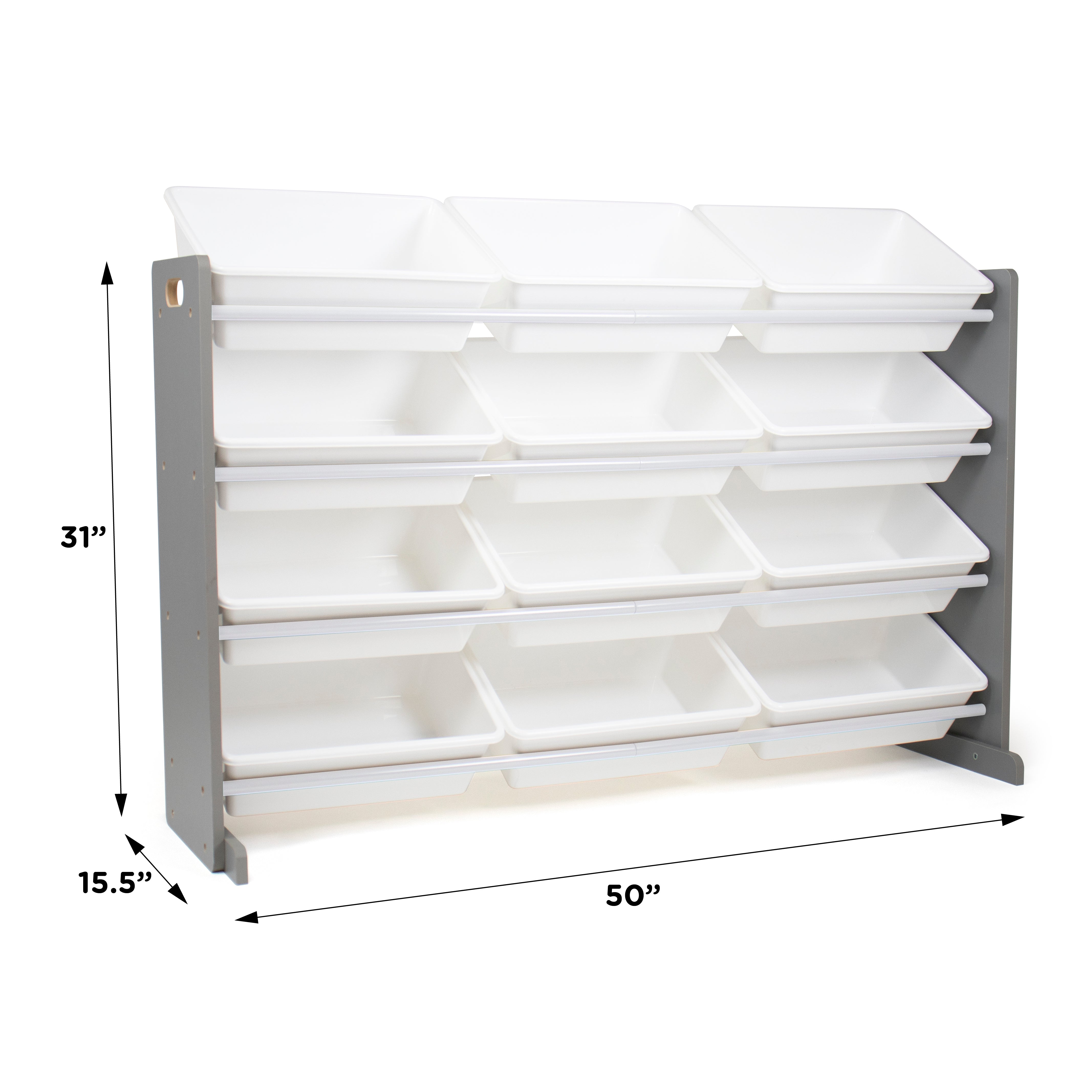 12 large storage containers are easy to remove, replace and reposition along the 4 tiered shelves—sized just right within the toy organizer for toddlers and preschool-aged children. It makes a great toy box storage alternative, helping keep your little one’s room clean and organized while at the same time teaching sorting and cognitive skills. The stylish grey and white colorway makes this the perfect organizational solution for bedrooms, playrooms and more.
